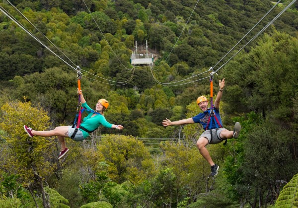 Three 200m dual flying fox ziplines will fly you smoothly side-by-side with a partner, friend or relative down into a stunning tract of original and regenerating native ‘bush’ (forest).