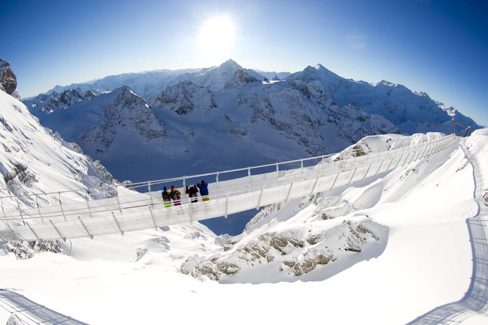 Taking aerial cable car Titlis Xpress and cable car Rotair to Mt. Titlis (3000 m) from Engelberg