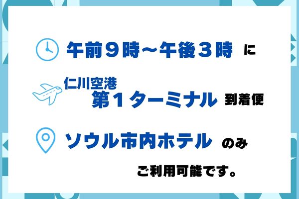 Information Share #1仁川国際空港1ターミナル(T1)⇒ソウルホテル 荷物配送サービス【Budify Express】 Overview Minimum Participants per Booking : 1 Departure City : Seoul(SOUTH KOREA) Tour Operator : INBOUND:H.I.S. KOREA CO.,LTD Tour Details 仁川空港1ターミナル(T1)⇒ソウルホテル荷物配送 PlanPriceBudify Express(~2026/06/30まで料金)SEL0933P01C01TYPE1(機内持ち込みサイズ) : USD 8 TYPE2(預入れ荷物サイズ) : USD 24 TYPE3(大型手荷物サイズ) : USD 39 This item can be booked only by request. Please contact our stores to book this item. Duration Child Policy Allowed Tour Date Meals Meal Not Included Time of Day Morning Pick-up Included Guide 仁川空港1ターミナル(T1)⇒The Summit Hotel Dongdaemun ご利用のホテルがThe Summit Hotel Dongdaemun(サミットホテル 東大門)の専用プランです。 The Summit Hotel Dongdaemunはホテル規定上、ロッカー利用必須のため、ロッカー利用料金が含まれております。 PlanPrice【サミットホテル 東大門】Budify Express(~2026/06/30まで料金)SEL0933P02C01TYPE1(機内持ち込みサイズ) : USD 11 TYPE2(預入れ荷物サイズ) : USD 26 TYPE3(大型手荷物サイズ) : USD 42 This item can be booked only by request. Please contact our stores to book this item. Duration Child Policy Allowed Tour Date Meals Meal Not Included Time of Day Morning Pick-up Included Guide Schedule * * * * * * * * * * * * * * * * * * * * * * * * * * * * * * Cancellation Policy 3day(s) before tour date 30 % of the total amount 2day(s) before tour date 50 % of the total amount 1day(s) before tour date 100 % of the total amount Remarks Information posted is subject to change without notice. #1仁川国際空港1ターミナル(T1)⇒ソウルホテル 荷物配送サービス【Budify Express】 Share on facebook Share on Google+ Share on twitter Share by e-mail