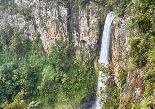 Purling Brook Fallsに到着 - 世界遺産の森を15分ほど散策し、落差100m超を誇 る園内最⼤の滝へ。切り⽴った断崖から流れ落ちる姿は圧巻です
