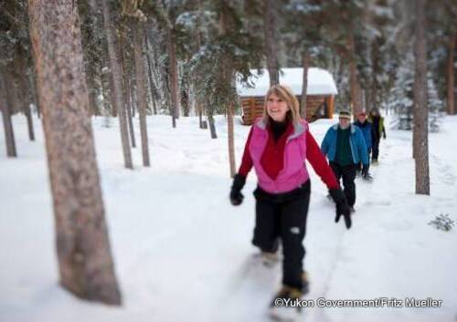 ホワイトホースに広がる雄大な自然の中をスノーシューズを履き、散策。運が良ければ、キツネや野ウサギなど