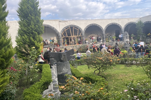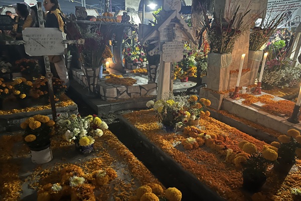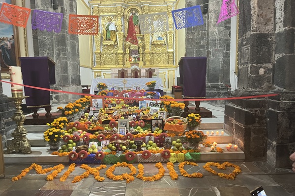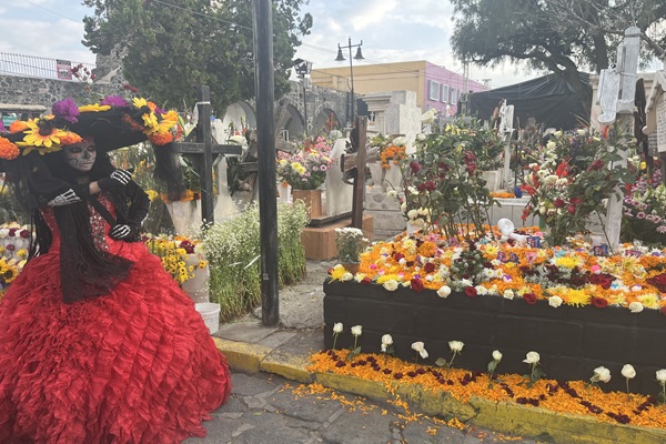 ソチミルコに到着。死者の日の伝統的な甘いパン・パンデムエルトをプレゼント